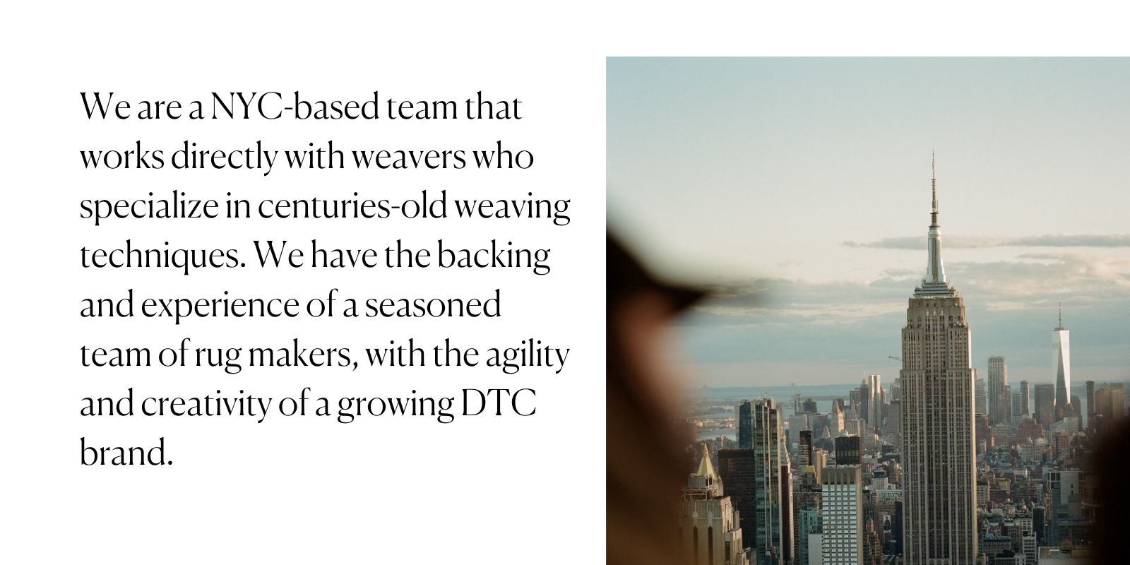NuStory is disrupting the rug industry – bringing authenticity, creativity and care to the craft. As the manufacturer and retailer, we guarantee our rugs are made at the intersection of high quality and value, all while prioritizing sustainability. From the craftsman to the customer – our story is one to feel good about. And we know when our rugs lay the foundation in a home, more feel-good stories are to come.